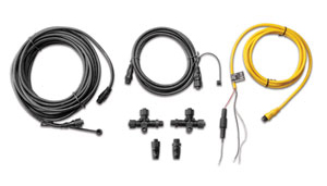 Garmin starter kit includes an NMEA 2000 drop cable (2 m), NMEA 2000 backbone cable (10 m), NMEA 2000 power cable (2 m), two NMEA 2000 T-connectors, NMEA 2000 male terminator and NMEA 2000 female terminator.
